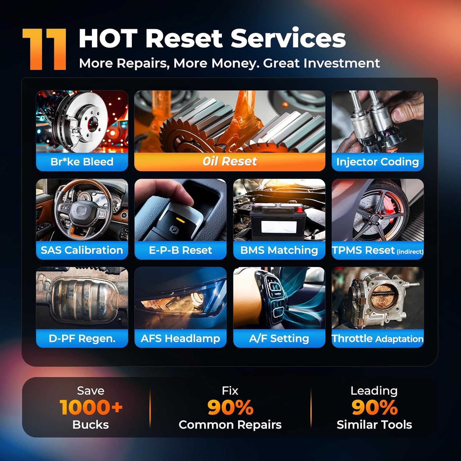 - 【11 Hottest Maintenance Services】Differ from MD808 PRO MD808 and other car scanner like NT716 CRP129X only 7 tests, Autel MD906 PRO obd2 scanner for cars provides 11 resets, same as MD909 PRO, including Oil Reset, ABS Break Bleeding, Injector Coding, SAS, Throttle, EPB, BMS, TPMS, D-P*F, AFS Headlamp, A/F. Works with 1996+ OBD2/EOBD/JOBD vehicles globally. this tool saves you time and money, making it perfect for post-repair calibrations!
