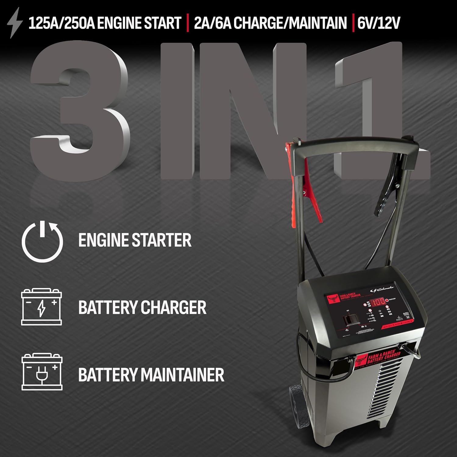 Schumacher Electric Farm and Ranch Wheeled 6A Charger and 250A Engine Starter, 4-in-1 Solution for 6V/12V Batteries, Maintainer, 50A Boost, FR01336, For Power Sport, Automotive, and Marine Batteries