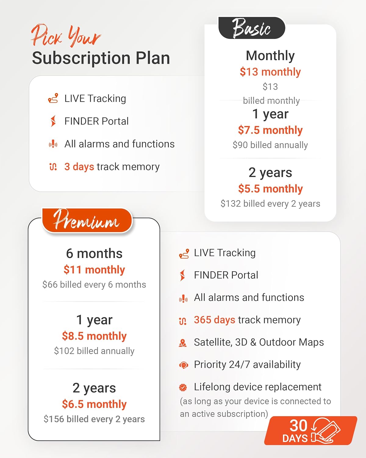 - SUBSCRIPTION REQUIRED: The PAJ GPS Power Finder includes a SIM card and offers lifetime device replacement. Enjoy 24/7 multilingual customer support and easy control via our free app, compatible with Android and iOS. Choose from flexible Premium or Basic plans, starting at $5.50/month, with options up to 2 years.