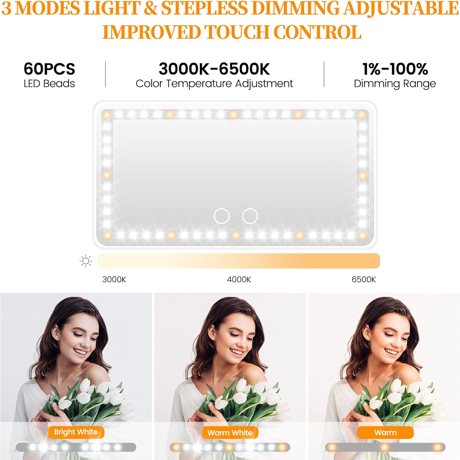 - DIMMABLE BICOLOR LED LIGHTS: The car makeup mirror has 12 yellow lights and 48 white lights, which is 40% brighter and 60% less energy than normal bulbs. Short press the 2 sensor switches to replace 3 light colors: white, yellow, white and yellow. Long press for dimming according to what you need. 2500-6500K color temperature is equivalent to outdoor sunlight, the makeup is naturally no difference