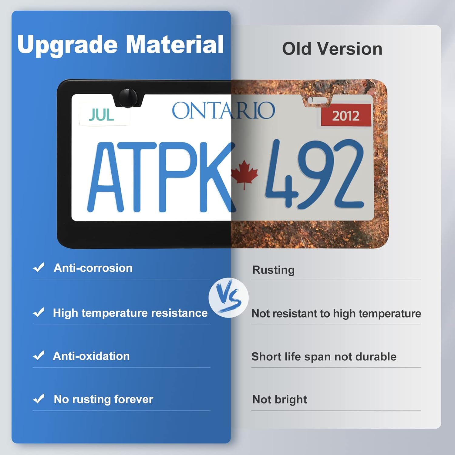 - STAINLESS STEEL LICENSE PLATE FRAME: The main characteristics are no rust, corrosion resistance, air and steam resistance. Wear-resistant, waterproof, not afraid of high temperature, easy to deal with all kinds of bad weather, avoid light pollution, easy to maintain.