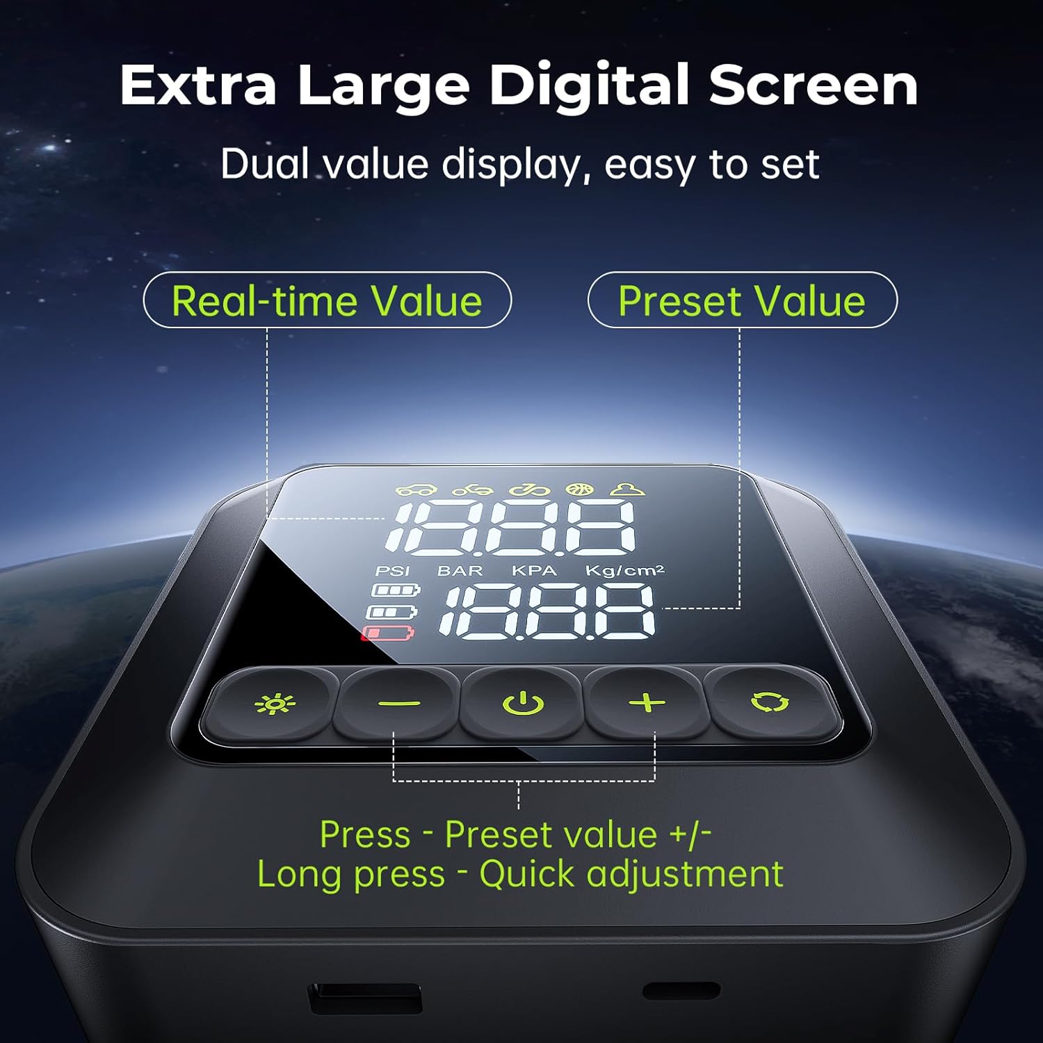 - 【Ultra-Large Bright LCD Display】- This portable tire inflator features an extra-large, easy-to-read LCD screen with dual pressure readings, and large buttons, allowing for precise pressure monitoring and easy operation. The top value displays real-time pressure while the bottom shows the preset target, ensuring accurate readings that are clearly visible in both daylight and at night.
