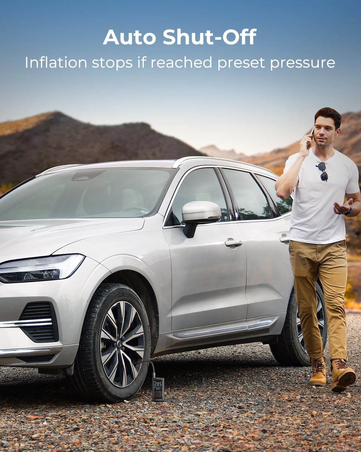 - [Accurate Gauges with Ultra-Large Clear LCD Display] The portable air compressor features an ultra-large LCD display, twice the size of others, with dual pressure readings for real-time and preset targets. Its high-precision sensor ensures accurate readings within ±0.5 psi. The display is clearly visible in both daylight and at night, ensuring precise tire pressure monitoring for improved safety.