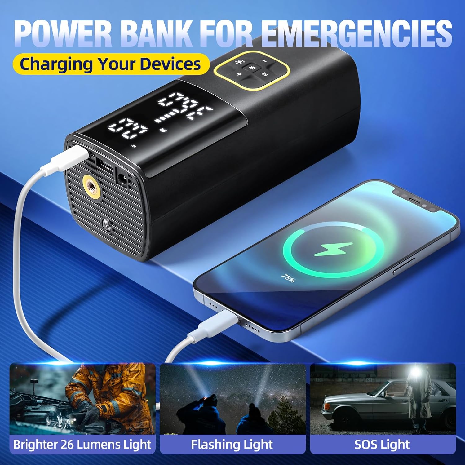 - 【Ultra-Portable Air Compressor & Easy to Use】The rechargeable tire inflator with detailed instruction manual, easy to use, weighs only 1.5 lbs and comes with a storage case. Fits easily in your trunk, backpack, or bike rack—perfect for road trips, camping, or emergencies. Practical gifts for men and women!