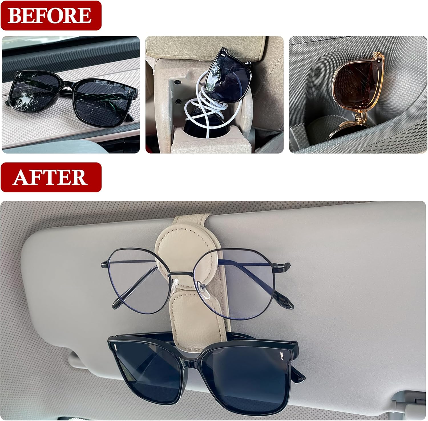 - Double Storage: This design can store 2 pairs of eyeglasses at once, fitting most types of eyewear, including sunglasses, prescription glasses, and reading glasses; enough space between clips to prevent from scratching each other for extra safety