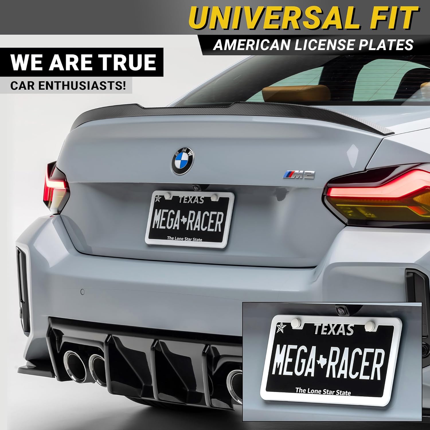 - CUSTOMER SERVICE: Mega Racer's 2 pc White License Plate Frame automotive accessories will leave both you and your ride satisfied. If you have any questions please send us a message via Amazon Message and we will be sure to respond within 24 hours.
