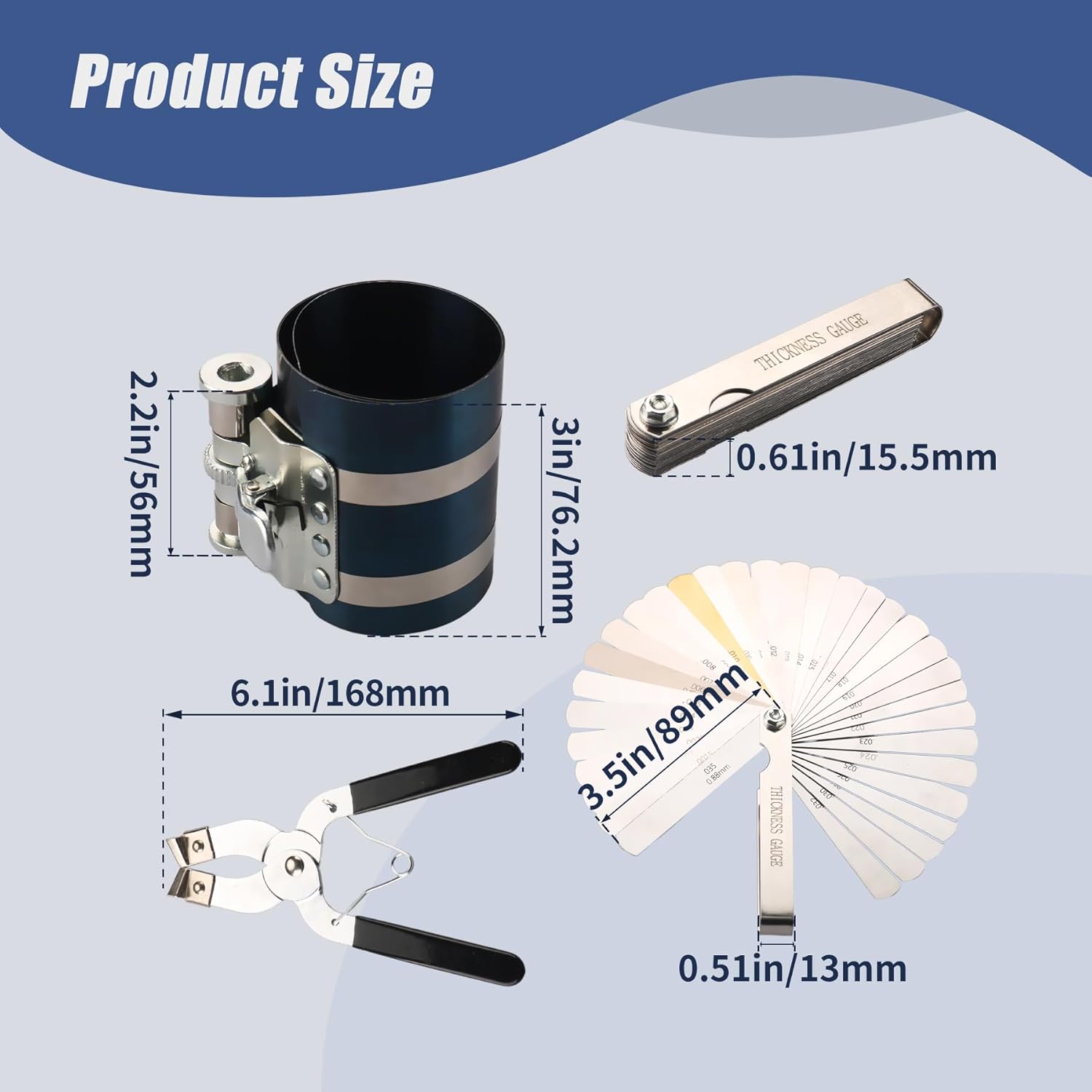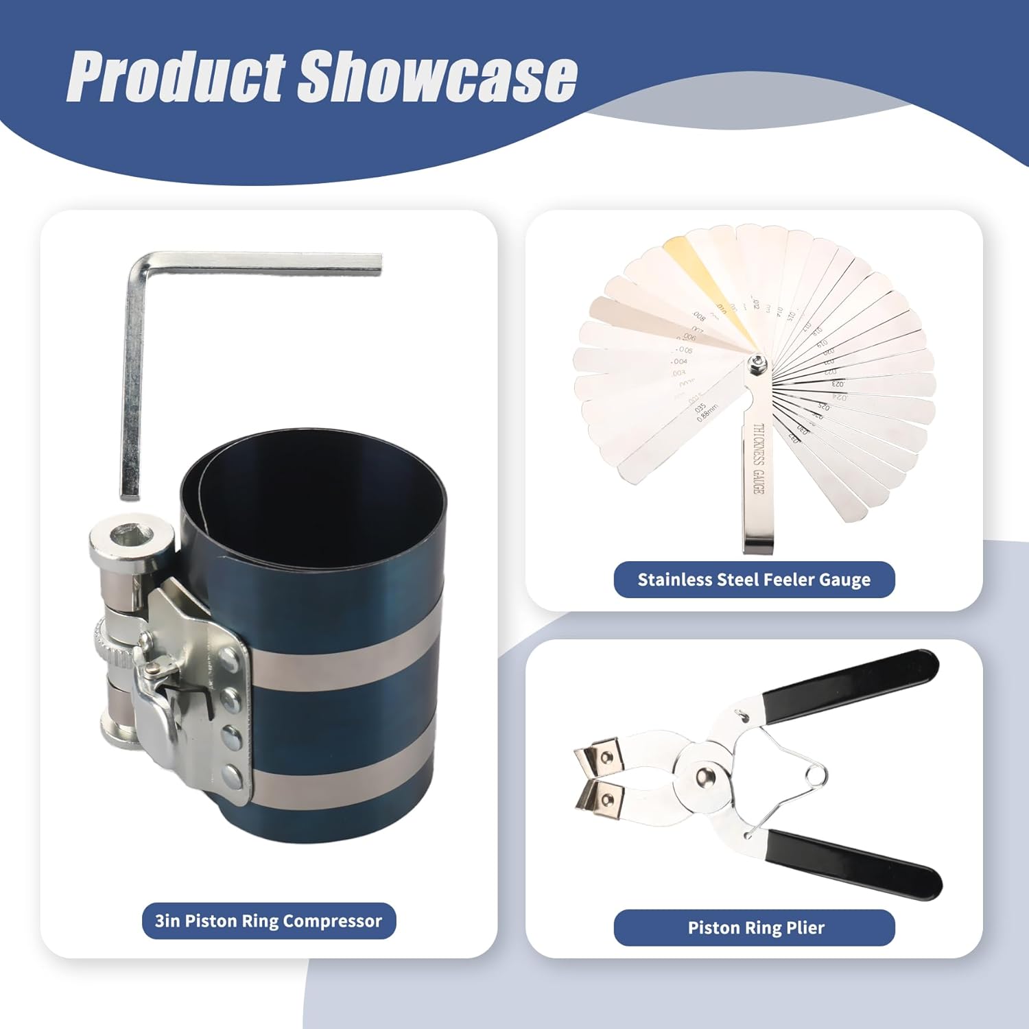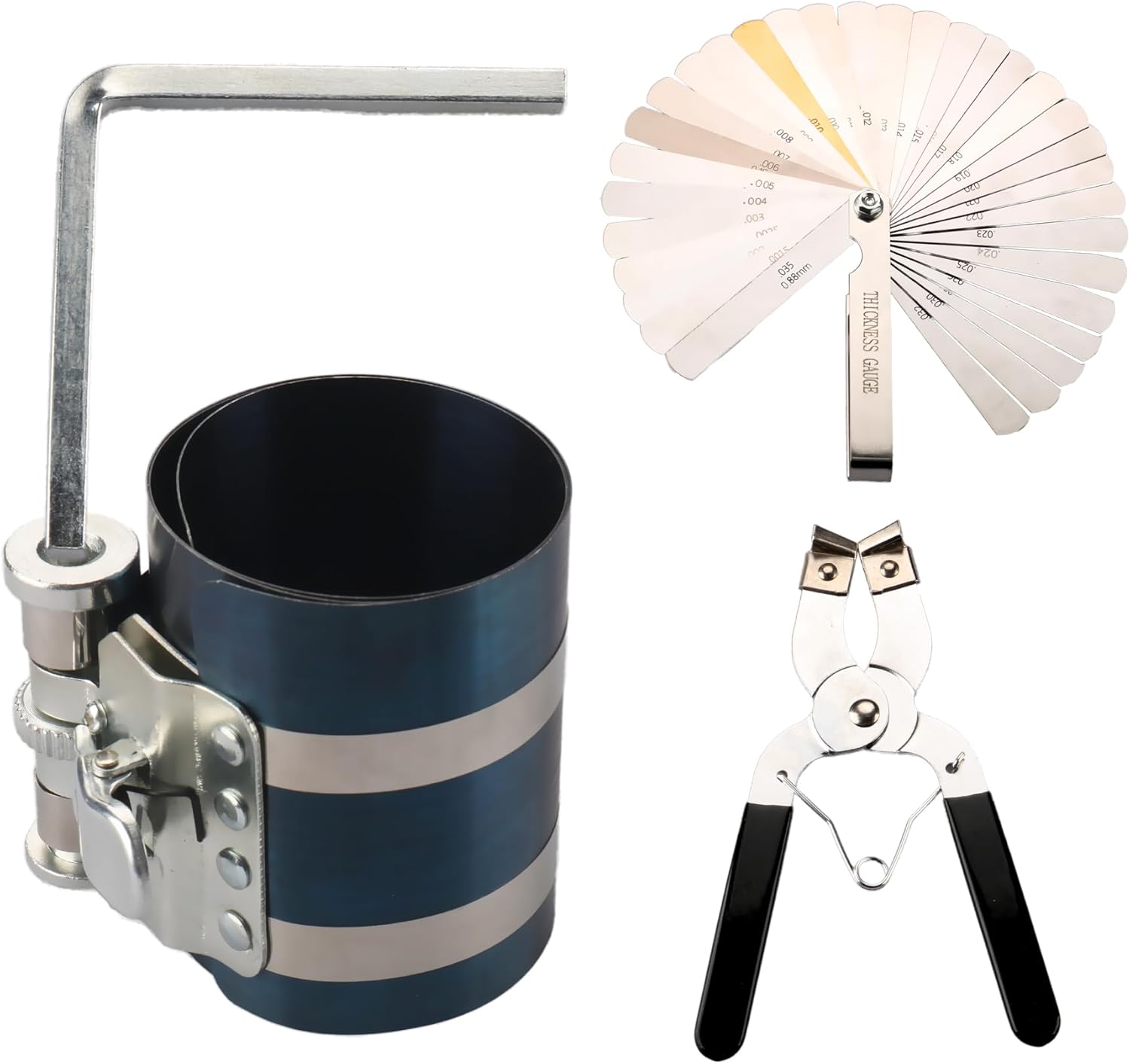 - Product Includes: 1 x 3 in. Piston Ring Compressor, 1 x Piston Ring Plier,1x Stainless Steel Feeler Gauge, 1 x Wrench