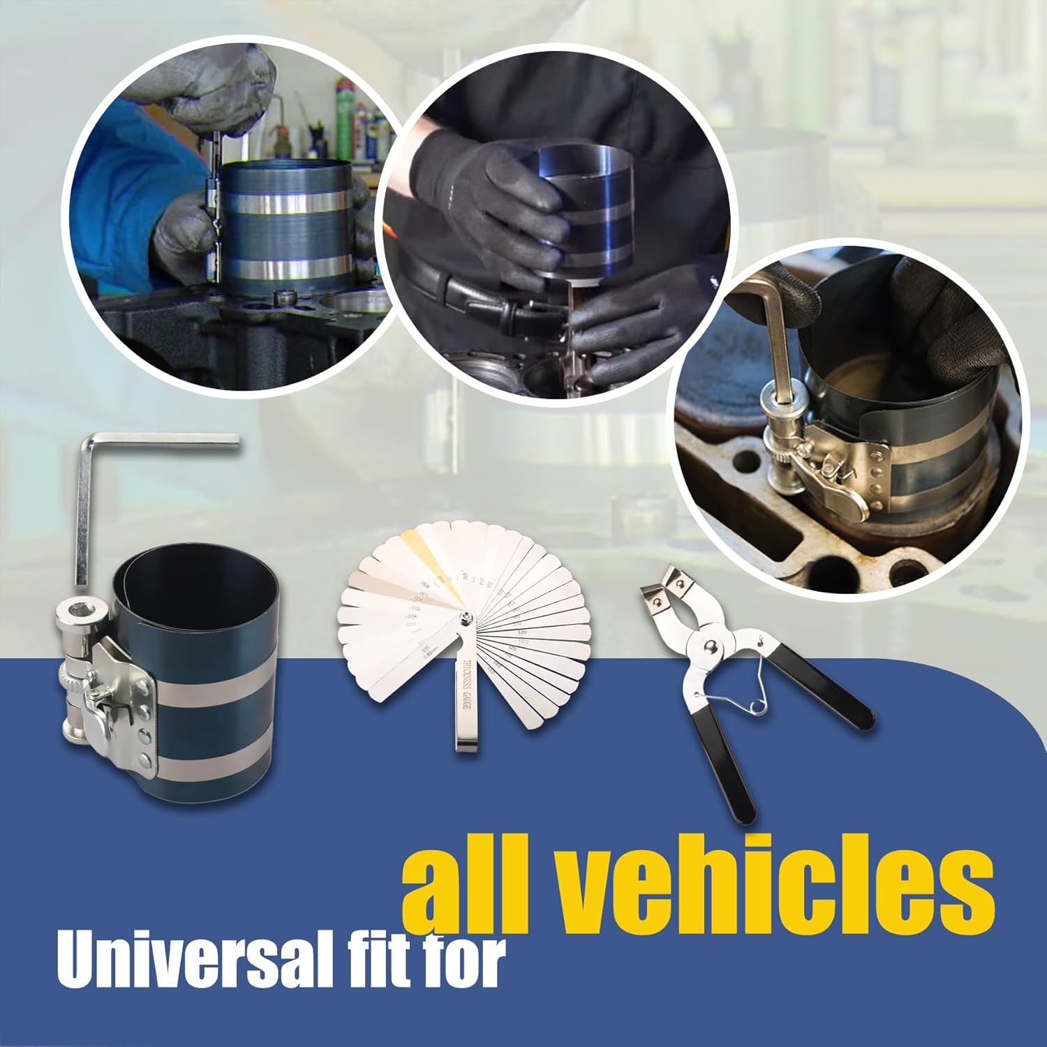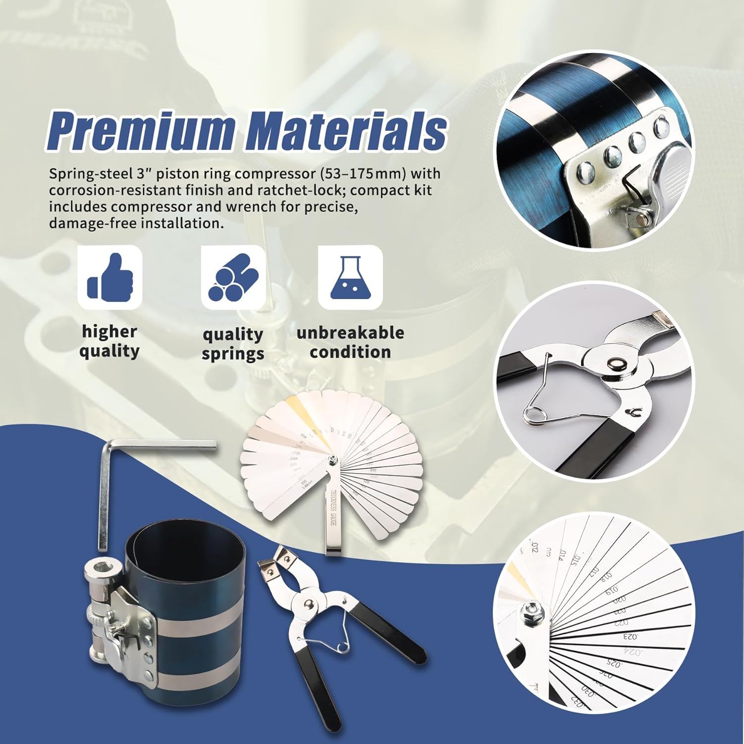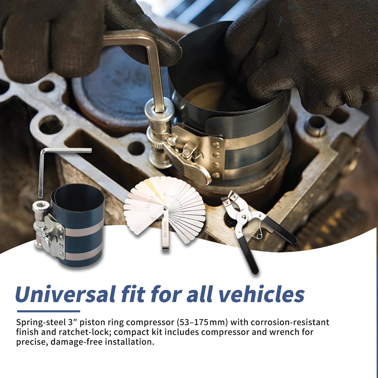 - Product Includes: 1 x 3 in. Piston Ring Compressor, 1 x Piston Ring Plier,1x Stainless Steel Feeler Gauge, 1 x Wrench
