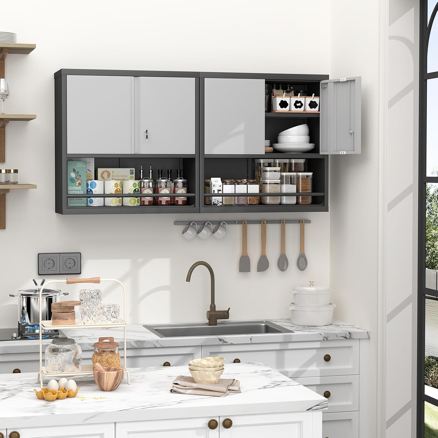 GREATMEET 31" H Locking Metal Garage Storage Cabinet with Doors and Shelves, Lockable Wall Cabinet Storage, Black&Grey Steel Wall Mount Cabinet Hanging Floating for Office Utility Room