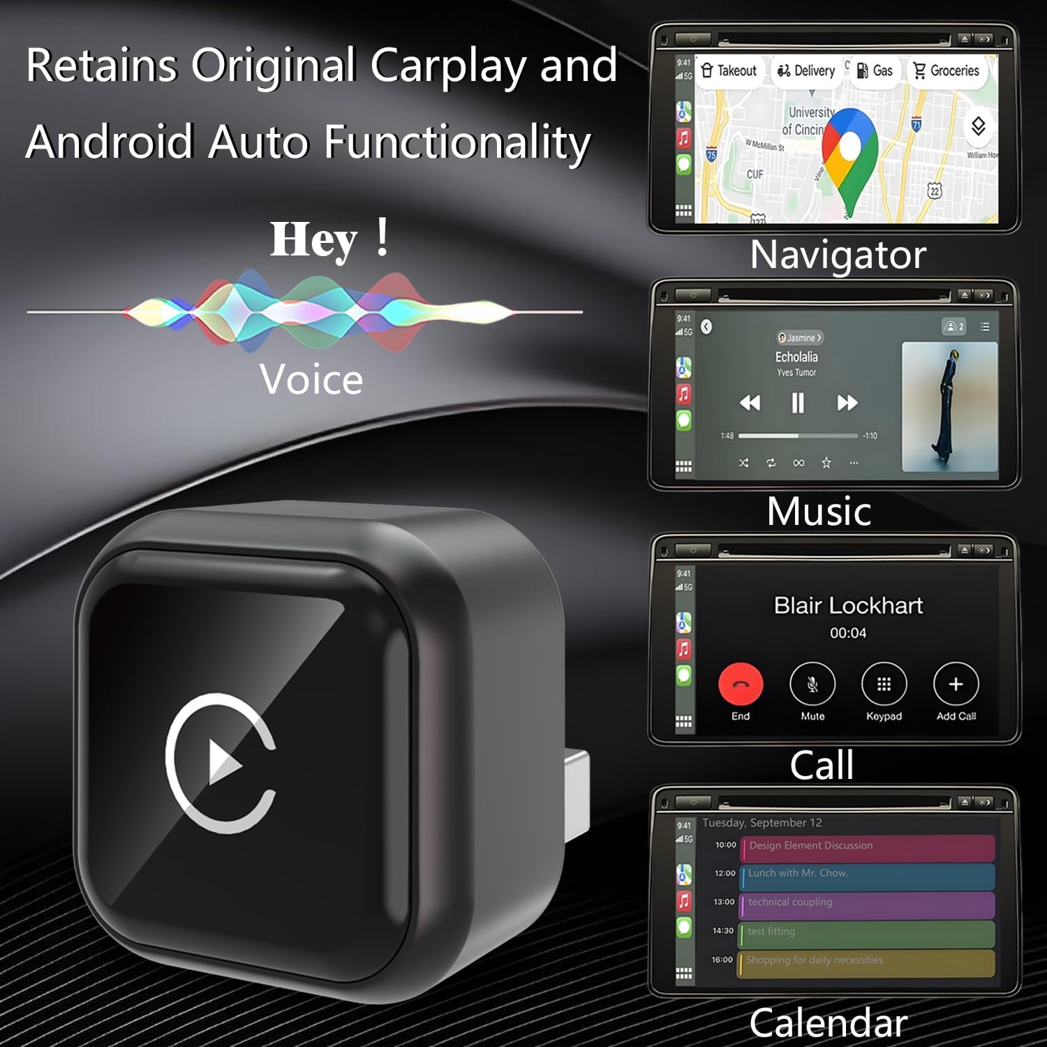 - 【Plug and Play ,Without Complex Settings】You can start using it by pairing it with Bluetooth. It can turn the factory wired Carplay and Android Auto function into wireless, realize navigation, voice, music, call, calendar and other functions. You only need to set up once, and the next time you start your car, you can realize automatic connection within 5-10s, which greatly improves your traveling efficiency.